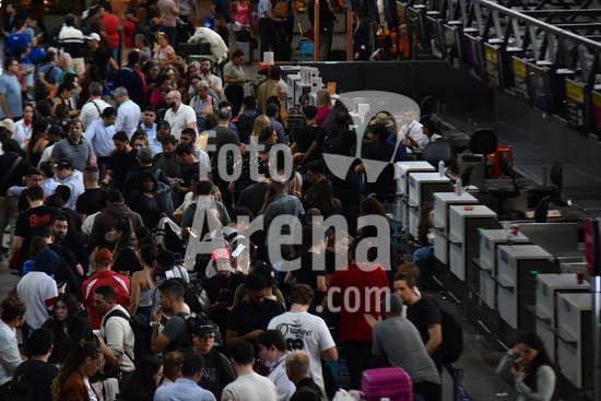 2857538 Aeroporto Internacional de Guarulhos tem voos cancelados e operação afetada devido aos efeitos do ciclone extratropical, nesta quinta feira (11). Na foto fila de passageiros aguardando.