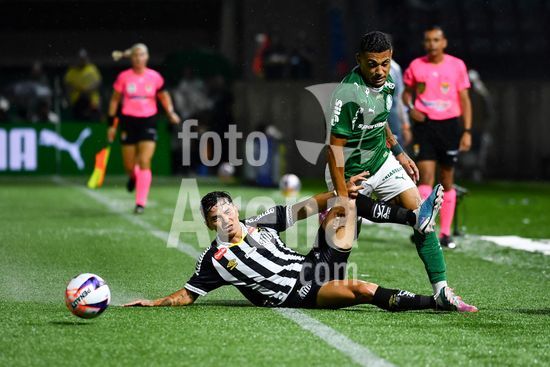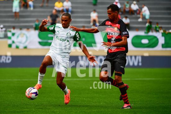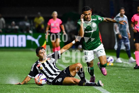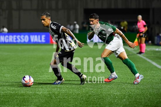 2868266 Luis Pacheco do Palmeiras e Barreal do Santos disputam a bola, durante partida entre Palmeiras x Santos, válida pela segunda rodada do Campeonato Paulista de Futebol 2026, nesta quarta feira (14), na Arena Crefisa Barueri, em Barueri, SP.