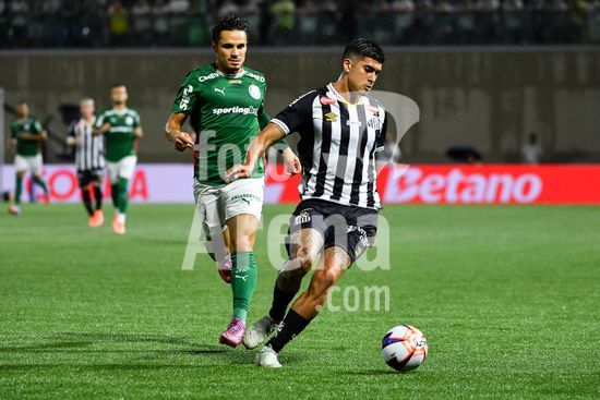 2868353 Raphael Veiga do Palmeiras e Adonis Frias do Santos disputam a bola durante partida entre Palmeiras x Santos, válida pela segunda rodada do Campeonato Paulista de Futebol 2026, nesta quarta feira (14), na Arena Crefisa Barueri, em Barueri, SP.