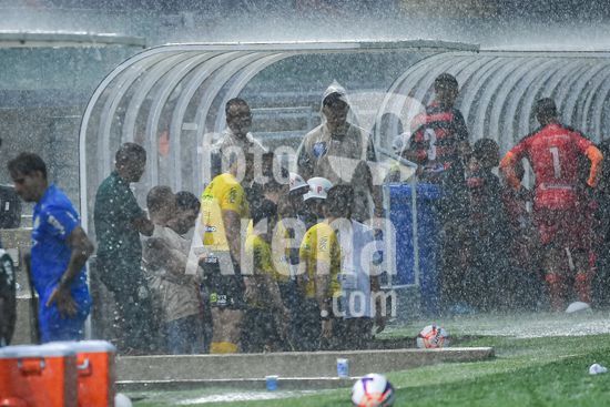 2868745 Banco de reservas do Flamengo com acumulo de água devido a chuva forte durante partida entre Palmeiras x AA Flamengo SP, válida pela terceira fase da Copa São Paulo de Futebol Júnior 2026, nesta quinta feira (15), na Arena Crefisa Barueri, em Barueri, SP.