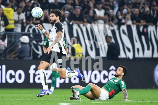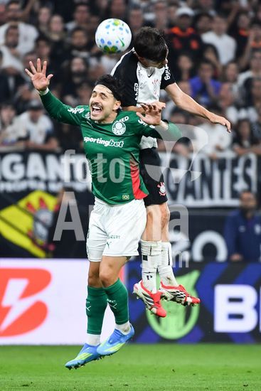 2923649 Sosa do Palmeiras e André do Corinthians disputando a bola, durante partida entre Corinthians x Palmeiras, válida pela decima primeira rodada do Campeonato Brasileiro de Futebol 2026, neste domingo (12), na Neo Química Arena, SP.