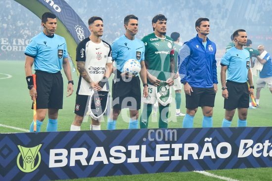 2923932 Equipe de arbitragem e capitães dos times durante partida entre Corinthians x Palmeiras, válida pela decima primeira rodada do Campeonato Brasileiro de Futebol 2026, neste domingo (12), na Neo Química Arena, SP.