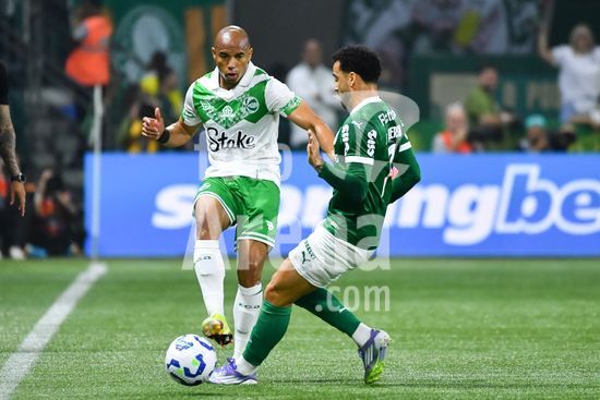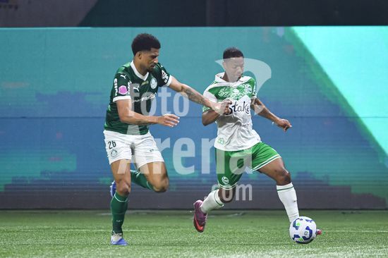 2821897 Abner do Juventude (E) e Felipe Anderson do Palmeiras disputam a bola, durante partida entre Palmeiras x Juventude, válida pela décima segunda rodada do Campeonato Brasileiro de Futebol 2025 (partida atrasada), neste sábado (11), no Allianz Parque, SP.
