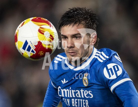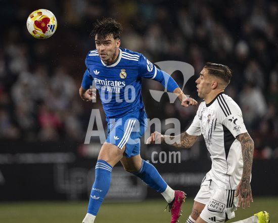 2868382 Raul Asencio, do Real Madrid, cabeceia a bola durante a partida das oitavas de final da Copa del Rey entre Albacete e Real Madrid no Estadio Carlos Belmonte em Albacete, Espanha. (Ricardo Nogueira/SPP)