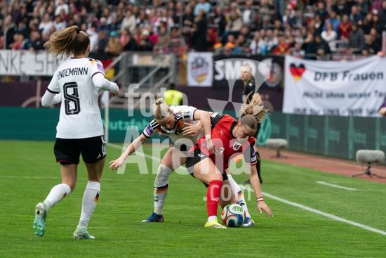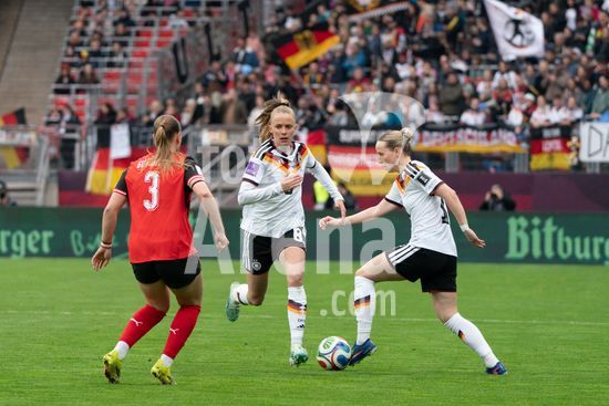2924702 NUREMBERG, ALEMANHA - 14 DE ABRIL: Janina Minge (5 Alemanha) e Franziska Kett (17 Alemanha) durante a partida de qualificacao para a Copa do Mundo Feminina da FIFA entre Alemanha e Austria no Estadio Max-Morlock em Nuremberg, Alemanha, em 14 de abril de 2026. (Qianru Zhang/SPP)