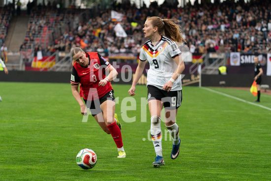 2924878 NUREMBERG, ALEMANHA - 14 DE ABRIL: Sarah Gutmann (3 Austria) e Sjoeke Nusken (9 Alemanha) durante a partida de qualificacao para a Copa do Mundo Feminina da FIFA entre Alemanha e Austria no Estadio Max-Morlock em Nuremberg, Alemanha, em 14 de abril de 2026. (Qianru Zhang/SPP)