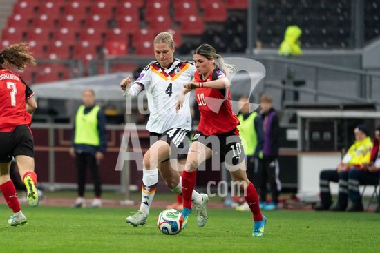 2924887 NUREMBERG, ALEMANHA - 14 DE ABRIL: Rebecca Knaak (4 Alemanha) e Eileen Campbell (10 Austria) durante a partida de qualificacao para a Copa do Mundo Feminina da FIFA entre Alemanha e Austria no Estadio Max-Morlock em Nuremberg, Alemanha, em 14 de abril de 2026. (Qianru Zhang/SPP)
