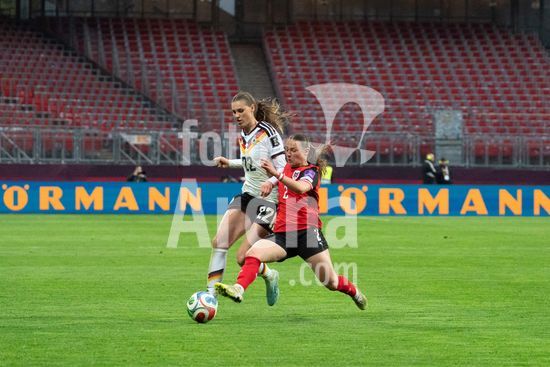 2924869 NUREMBERG, ALEMANHA - 14 DE ABRIL: Sarah Gutmann (3 Austria) e Vivien Endemann (8 Alemanha) durante a partida de qualificacao para a Copa do Mundo Feminina da FIFA entre Alemanha e Austria no Estadio Max-Morlock em Nuremberg, Alemanha, em 14 de abril de 2026. (Qianru Zhang/SPP)