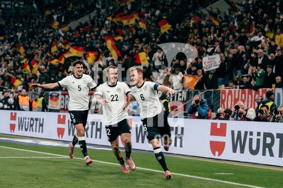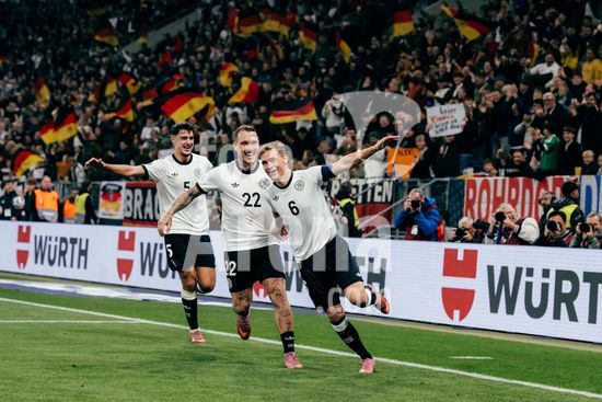 2821335 Sinsheim, Alemanha, 10 de outubro de 2025 Joshua Kimmich (#6 - Alemanha) comemora seu gol de 4 a 0 com David Raum (#22 - Alemanha) e Aleksandar Pavlovic (#5 - Alemanha) durante a partida das Eliminatorias Europeias da UEFA entre Alemanha e Luxemburgo na PreZero Arena, em Sinsheim, Alemanha. (Gabor Baumgarten / SPP) (Gabor Baumgarten / SPP)
