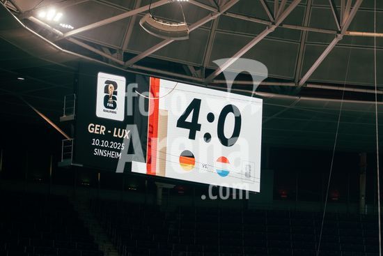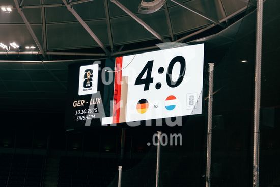 2821333 Sinsheim, Alemanha, 10 de outubro de 2025. Placar com o resultado final de 4 a 0 para a Alemanha durante a partida das Eliminatorias Europeias da UEFA entre Alemanha e Luxemburgo na PreZero Arena, em Sinsheim, Alemanha. (Gabor Baumgarten / SPP) (Gabor Baumgarten / SPP)