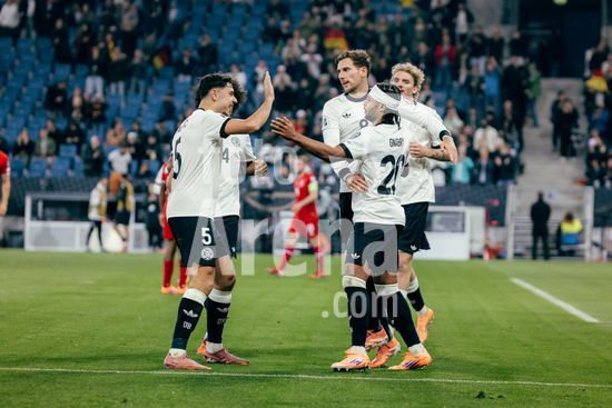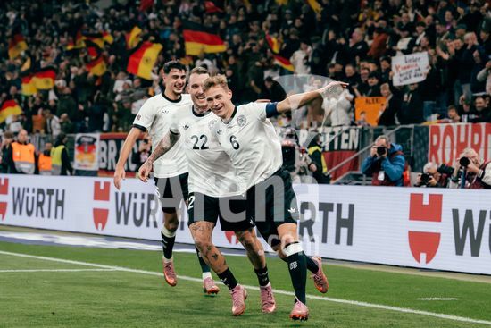 2821334 Sinsheim, Alemanha, 10 de outubro de 2025 Joshua Kimmich (#6 - Alemanha) comemora seu gol de 4 a 0 com David Raum (#22 - Alemanha) e Aleksandar Pavlovic (#5 - Alemanha) durante a partida das Eliminatorias Europeias da UEFA entre Alemanha e Luxemburgo na PreZero Arena, em Sinsheim, Alemanha. (Gabor Baumgarten / SPP) (Gabor Baumgarten / SPP)