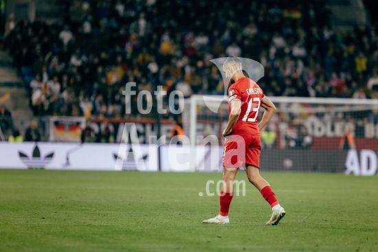 2821529 Sinsheim, Alemanha, 10 de outubro de 2025. Dirk Carlson (#13 - Luxemburgo) deixando o campo apos receber cartao vermelho durante a partida das Eliminatorias Europeias da UEFA entre Alemanha e Luxemburgo, na PreZero Arena, em Sinsheim, Alemanha. (Gabor Baumgarten / SPP) (Gabor Baumgarten / SPP)