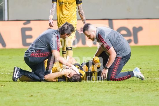 2928407 America MG x Sport, em jogo válido pela Série B do Campeonato Brasileiro, em Belo Horizonte, MG, na noite deste sábado 18. Na foto, Médicos atendendo jogador.