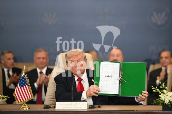 ny131025135312 President Donald Trump signs a document during a peace summit in Sharm El-Sheikh, Egypt, on Monday, Oct. 13, 2025. The meeting in Egypt could expedite an end to the Gaza war, but regional powers must still resolve the thorny details that have stymied negotiations. (Kenny Holston/The New York Times/Fotoarena)
