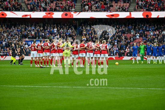 2840780 Arbitros e jogadores do Arsenal e do Chelsea fazem um minuto de silencio em memoria das vitimas do crime, antes da partida da Barclays Women's Super League entre Arsenal e Chelsea, no Emirates Stadium, em 8 de novembro de 2025, em Londres, Inglaterra. (Yaroslav Dunka / SPP)