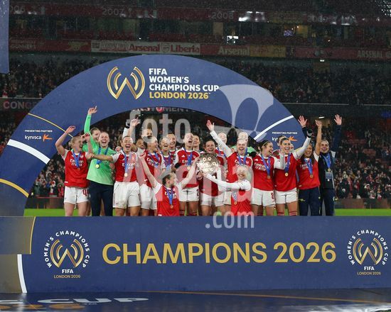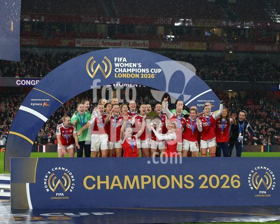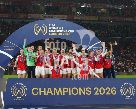 Londres, Inglaterra, 1 de fevereiro de 2026: Jogadoras do Arsenal levantam o trofeu apos a final da Copa dos Campeoes Feminina da FIFA 2026 entre Arsenal e SC Corinthians no Emirates Stadium em Londres, Inglaterra. (Foto de Jay Patel/Sports Press Photo/SPP) (Jay Patel/Sports Press Photo/SPP)