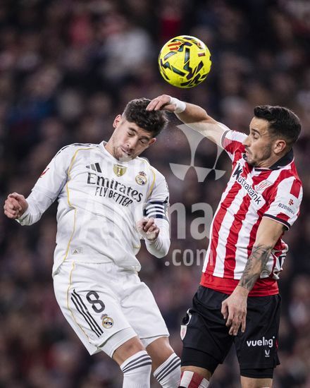2852584 Federico Valverde, do Real Madrid, cabeceia a bola durante a partida da La Liga entre Athletic Club e Real Madrid, no estadio San Mames, em Bilbao, Espanha. (Ricardo Nogueira/SPP)