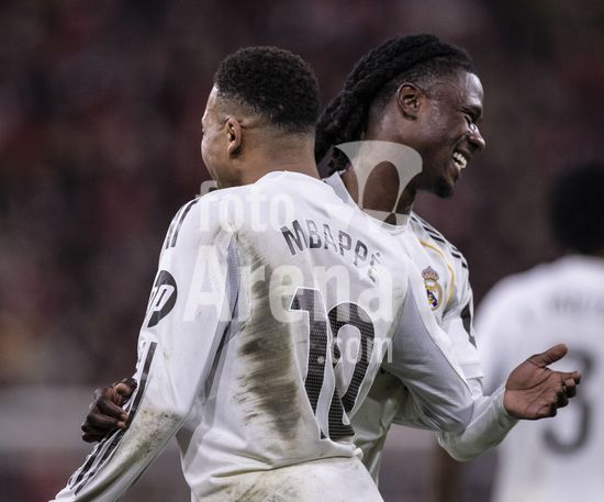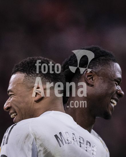 2852603 Eduardo Camavinga, do Real Madrid, comemora com Kylian Mbappe, tambem do Real Madrid, apos marcar o segundo gol da equipe durante a partida da La Liga entre Athletic Club e Real Madrid, no estadio San Mames, em Bilbao, Espanha. (Ricardo Nogueira/SPP)