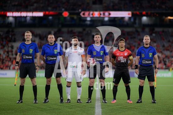 2868203 Árbitro Lucas Casagrande, auxiliares e os capitães Boschilia e João Cruz durante Athletico e Operário. Partida válida pela 1ª rodada do Campeonato Paranaense 2026. Estádio Mario Celso Petraglia em Curitiba, Paraná.