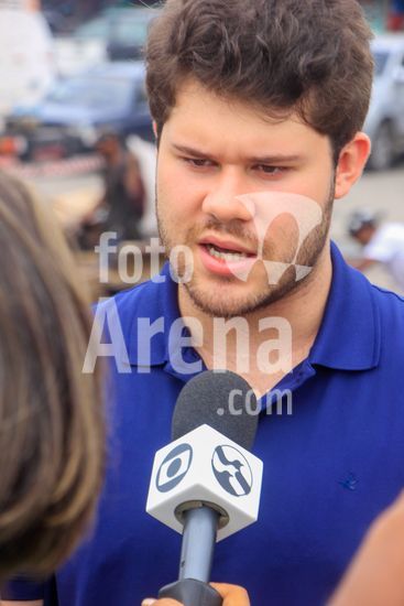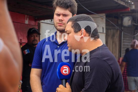 2862330 Um incêndio de grandes proporções na noite de domingo, destruiu 50 barracas no mercado da produção, na manhã desta segunda (22), o local demonstrava grande destruição, o corpo de bombeiros trabalhou boa parte da noite até as 3 da madrugada. Grande movimentação de pessoas recolhendo materiais como madeiras, aluminios e produtos das lojas destruidas com o incendio. Na foto: Imprensa entrevista Caio Beltrão (Sec. municipal de abastecimento, pesca e agricultura)