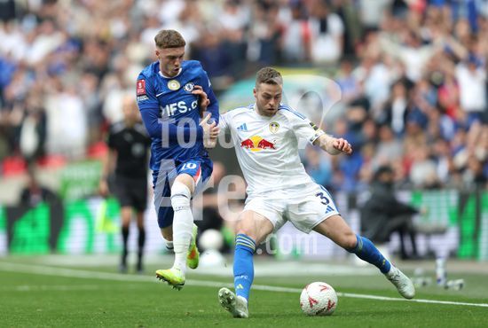2932518 LONDRES, INGLATERRA, 26 DE ABRIL: Gabriel Gudmundsson, do Leeds United, disputa a bola com Cole Palmer, do Chelsea, durante a partida entre Chelsea FC e Leeds United FC, valida pela semifinal da Copa da Inglaterra (Emirates FA Cup), no Estadio de Wembley, em Londres, Inglaterra, em 26 de abril. (Foto de Daniel Weir) (Daniel Weir/Sports Press Photo / SPP)