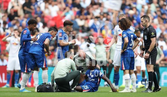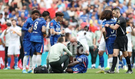 2932520 LONDRES, INGLATERRA, 26 DE ABRIL: Moises Caicedo, do Chelsea, recebe atendimento medico apos se lesionar durante a partida entre Chelsea FC e Leeds United FC, valida pela semifinal da Copa da Inglaterra (Emirates FA Cup), no Estadio de Wembley, em Londres, Inglaterra, em 26 de abril. (Foto de Daniel Weir) (Daniel Weir/Sports Press Photo / SPP)