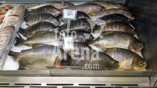 Peixes frescos, incluindo Tilápia (à esquerda, com preço de R$ 23,90/kg) e Tambaqui (à direita), são exibidos em uma banca de peixaria sobre uma espessa camada de gelo para garantir sua conservação no interior de um supermercado em São Paulo, SP. A imagem destaca a diversidade de pescado disponível para o consumidor em mercados e supermercados no Brasil. O Tambaqui (Colossoma macropomum) é um peixe de água doce nativo da Bacia Amazônica, muito apreciado na culinária regional, enquanto a Tilápia, de origem africana, se tornou um dos peixes mais cultivados e consumidos no país devido à sua rápida crescita e adaptabilidade. Esta cena ilustra um elo importante na cadeia alimentar e na economia, conectando a pesca e a aquicultura ao comércio varejista e à mesa do brasileiro, sendo um tema relevante para estudos em biologia, economia e cultura alimentar.