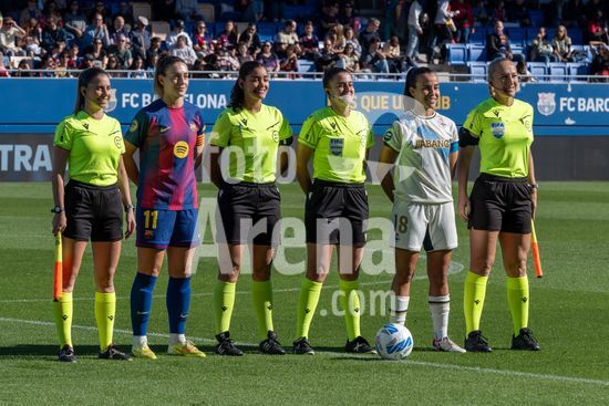 2841547 Ambas as capitas Alexia Putellas (11 Barcelona) e Raquel Garcia (18 Deportivo) com os arbitros antes do jogo da Liga F Moeve entre FC Barcelona Femeni x FC Deportivo Abanca no Estadi Johan Cryuff em Barcelona, Espanha. (Carla Feijo/SPP) (Carla Feijoo / SPP)