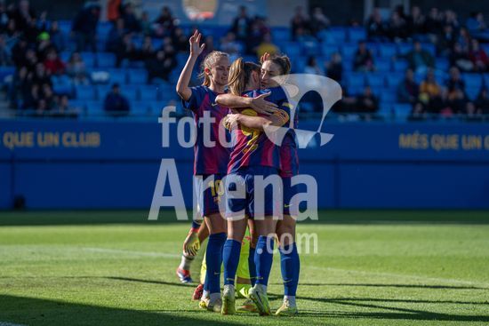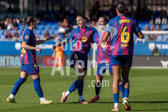 2841558 Maria Leon (4 Barcelona), Laia Alexandri (5 Barcelona), Ona Batlle (22 Barcelona) e Sydney Schertenleib (6 Barcelona) comemorando o gol de Laia Alexandri (4-0) durante o jogo da Liga F Moeve entre FC Barcelona Femeni x FC Deportivo Abanca no Estadi Johan Cryuff em Barcelona, Espanha. (Carla Feijo/SPP) (Carla Feijoo / SPP)