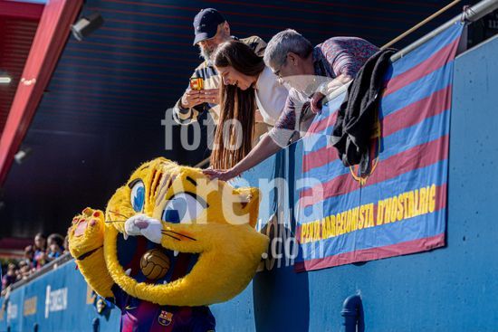 2841566 Torcedores do Barcelona tirando uma foto com o mascote do Barcelona, Cat, no intervalo do jogo da Liga F Moeve entre FC Barcelona Femeni x FC Deportivo Abanca, no Estadi Johan Cryuff, em Barcelona, Espanha. (Carla Feijo/SPP) (Carla Feijoo / SPP)