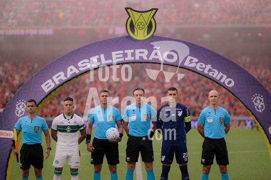 2910057 Árbitro Raphael Claus, auxiliares e os capitães Sebastian Gómez e Santos durante Athletico e Coritiba. Partida válida pela 8ª rodada do Campeonato Brasileiro 2026. Estádio Mario Celso Petraglia em Curitiba, Paraná.