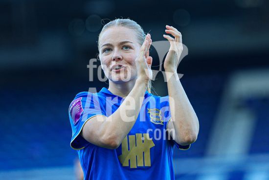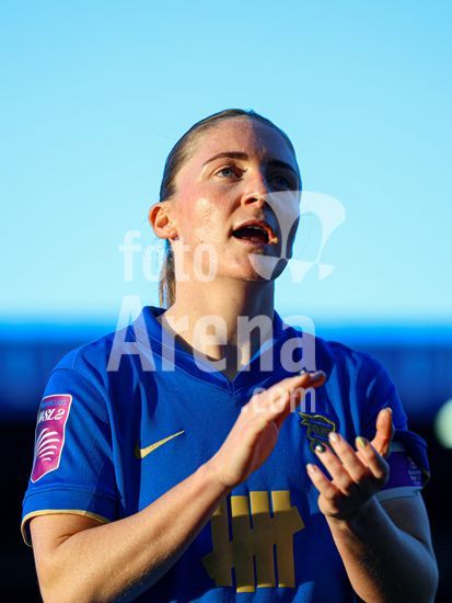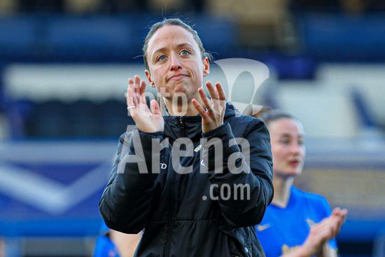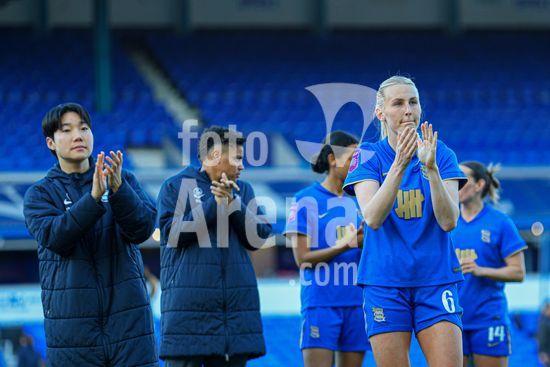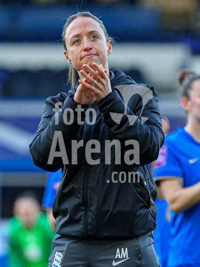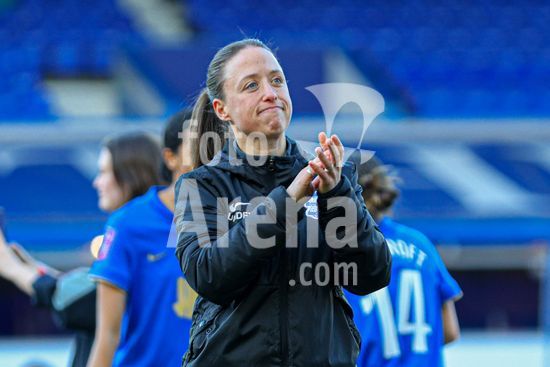 2920435 BIRMINGHAM, INGLATERRA - 6 de abril: A treinadora do Birmingham City, Amy Merricks, aplaude os torcedores apos o apito final da partida da Copa da Inglaterra Feminina da Adobe entre Birmingham City e Manchester City, no Estadio St. Andrews, em Birmingham, Inglaterra, em 6 de abril. (Natalie Mincher/SPP)