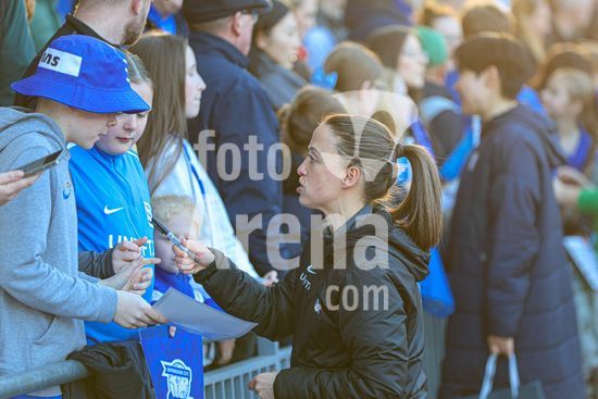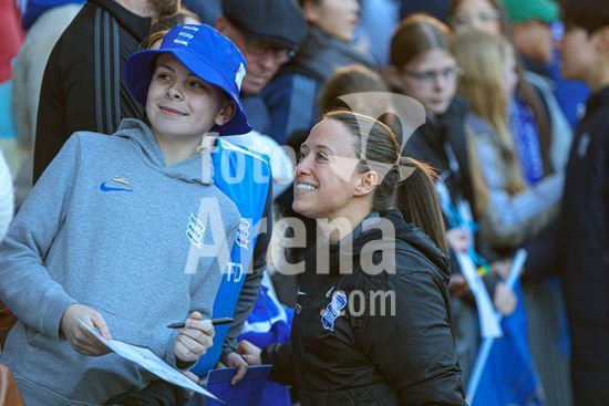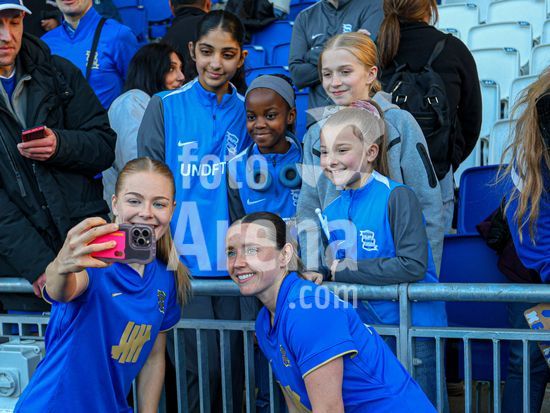 2920450 BIRMINGHAM, INGLATERRA - 6 de abril: Lily Crosthwaite e Shanade Hopcroft, do Birmingham City, posam para uma foto com torcedores apos a partida da Copa da Inglaterra Feminina (Adobe Women's FA Cup) entre Birmingham City e Manchester City, no Estadio St. Andrews, em Birmingham, Inglaterra, em 6 de abril. (Natalie Mincher/SPP)