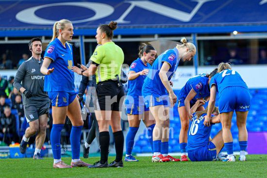 2920462 BIRMINGHAM, INGLATERRA - 6 de abril: Lily Crosthwaite, do Birmingham City, e ajudada a se levantar apos ser atingida pela goleira Khiara Keating, do Manchester City, durante a partida da Copa da Inglaterra Feminina da Adobe entre Birmingham City e Manchester City, no Estadio St. Andrews, em Birmingham, Inglaterra, em 6 de abril. (Natalie Mincher/SPP)