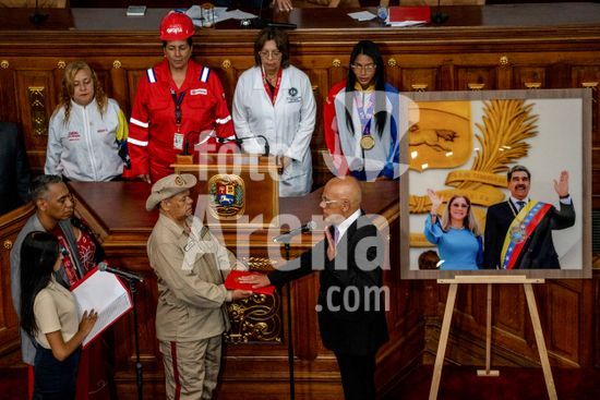 ny050126180611 Jorge Rodríguez is sworn in as president of the National Assembly, in Caracas, on Monday, Jan. 5, 2026. He is the brother of Venezuela?s new interim leader, Delcy Rodríguez. A new portrait of Nicolás Maduro, the ousted Venezuelan leader, and his wife, Cilia Flores, is displayed after it was unveiled earlier. (Alejandro Cegarra/The New York Times/Fotoarena)