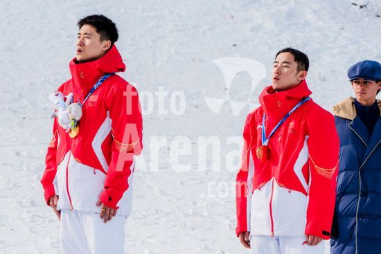 ny200226135910 Gold medalist Xindi Wang left, and bronze medalist Tianma Li of China on the podium after the freestyle skiing men?s aerials final during the 2026 Milan Cortina Winter Olympics in Livigno, Italy, on Friday, Feb. 20, 2026. (Gabriela Bhaskar/The New York Times/Fotoarena)