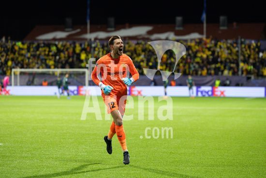 2870751 O goleiro Nikita Haikin (12 Bodo/Glimt) comemora apos um gol de seus companheiros de equipe durante a partida de futebol da Liga dos Campeoes da UEFA entre Bodo/Glimt e Manchester City em Aspmyra, em Bodo, Noruega. (Ane Frosaker / SPP)
