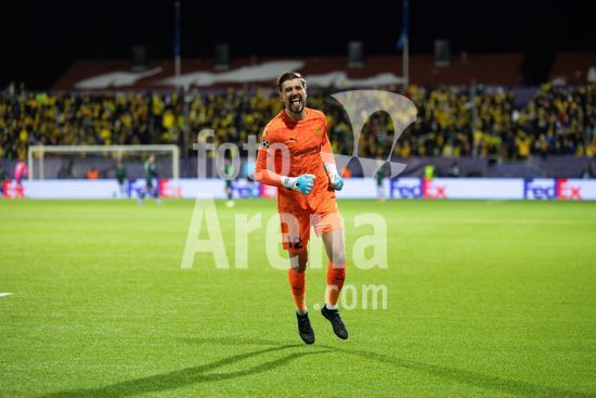 2870750 O goleiro Nikita Haikin (12 Bodo/Glimt) comemora apos um gol de seus companheiros de equipe durante a partida de futebol da Liga dos Campeoes da UEFA entre Bodo/Glimt e Manchester City em Aspmyra, em Bodo, Noruega. (Ane Frosaker / SPP)