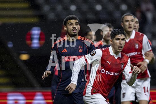 2872004 Gabriel Martinez, 77 do SC Braga, e Douglas Luiz, 12 do Nottingham Forest, disputam a posse de bola durante a partida da Liga Europa da UEFA entre SC Braga e Nottingham Forest, no Estadio Municipal de Braga, em 22 de janeiro de 2026. (João Bravo/SPP)