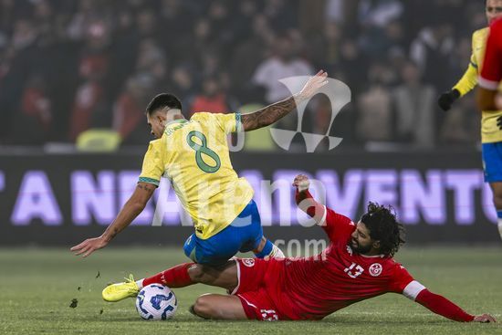 2844757 Sassi, da Tunisia (D), e Bruno Guimaraes, do Brasil (E), disputam a posse de bola durante o amistoso internacional entre Brasil e Tunisia na Decathlon Arena, em 18 de novembro de 2025, em Lille, Franca.