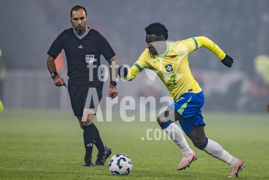 2844782 Vinicius Junior, do Brasil, controla a bola durante o amistoso internacional entre Brasil e Tunisia na Decathlon Arena, em 18 de novembro de 2025, em Lille, Franca.