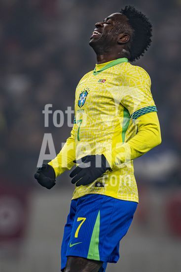 2844783 Vinicius Junior, do Brasil, reage durante o amistoso internacional entre Brasil e Tunisia na Decathlon Arena, em 18 de novembro de 2025, em Lille, Franca.