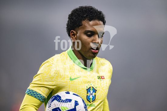2844786 Rodrygo, do Brasil, segura a bola durante o amistoso internacional entre Brasil e Tunisia na Decathlon Arena, em 18 de novembro de 2025, em Lille, Franca.