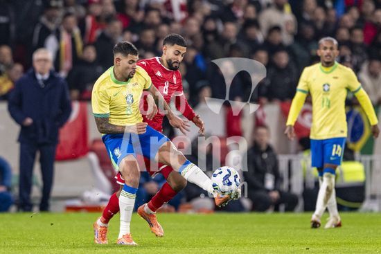 2844654 LILLE, FRANCA - 18 DE NOVEMBRO: Wesley, do Brasil (E), e Abdi, da Tunisia (D), disputam a posse de bola durante o amistoso internacional entre Brasil e Tunisia na Decathlon Arena, em 18 de novembro de 2025, em Lille, Franca. (Richard Callis/Fotoarena)