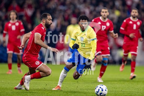 2844656 LILLE, FRANCA - 18 DE NOVEMBRO: Rodrygo, do Brasil (D), e Meriah, da Tunisia (E), disputam a posse de bola durante o amistoso internacional entre Brasil e Tunisia na Decathlon Arena, em 18 de novembro de 2025, em Lille, Franca. (Richard Callis/Fotoarena)