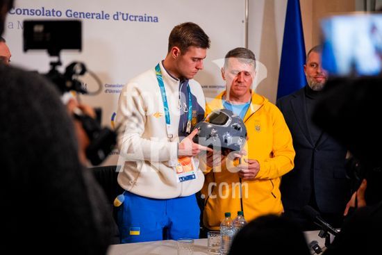 ny120226181012 Vladyslav Heraskevych, a Ukrainian skeleton athlete, holds the helmet that led to his disqualification from the 2026 Milan Cortina Winter Olympics, at a press conference at the Ukrainian General Consulate in Milan on Thursday, Feb. 12, 2026. The IOCÕs decision to disqualify Heraskevych over his helmet honoring countrymen killed in the war with Russia touched off the biggest crisis of the Games in Italy. (Vincent Alban/The New York Times/Fotoarena)