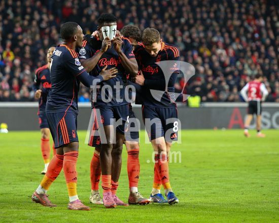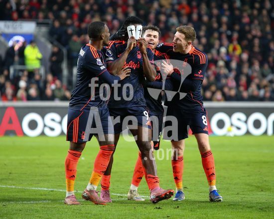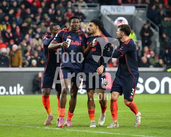 Londres, Inglaterra, 25 de janeiro de 2026: Taiwo Awoniyi (9, Nottingham Forest) comemora apos marcar o gol que colocou seu time em vantagem de 2 a 0 durante a partida da Premier League entre Brentford e Nottingham Forest no Gtech Community Stadium, em Londres, Inglaterra. (Jay Patel/Sports Press Photo/SPP)