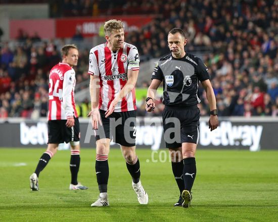 2906836 LONDRES, INGLATERRA - 16 DE MARCO: Nathan Collins, do Brentford, reclama com o arbitro de campo Stuart Attwell sobre uma decisao durante a partida da Premier League entre Brentford e Wolverhampton Wanderers no Gtech Community Stadium em 16 de marco de 2026 em Londres, Inglaterra. (Jay Patel/SPP)