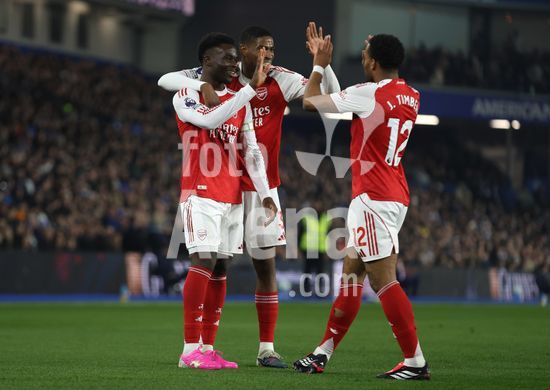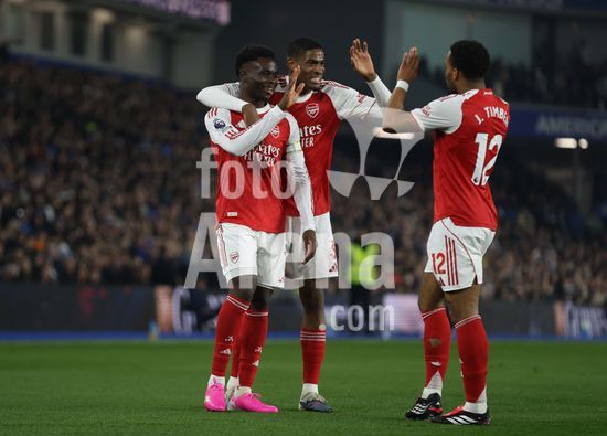 2898239 BRIGHTON, INGLATERRA, 4 DE MARCO: GOL 1-0, Bukayo Saka, do Arsenal, comemora o gol com Cristhian Mosquera e Jurrien Timber, tambem do Arsenal, apos marcar o gol que colocou o Arsenal em vantagem por 1 a 0 durante a partida entre Brighton & Hove Albion FC e Arsenal FC pela Premier League, no AMEX Community Stadium, em Brighton, Inglaterra, em 4 de marco. (Daniel Weir/ SPP)