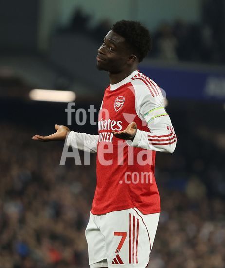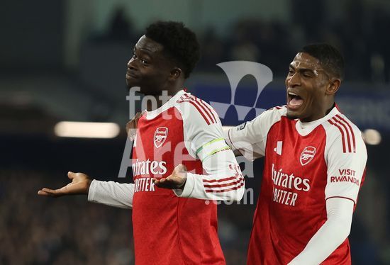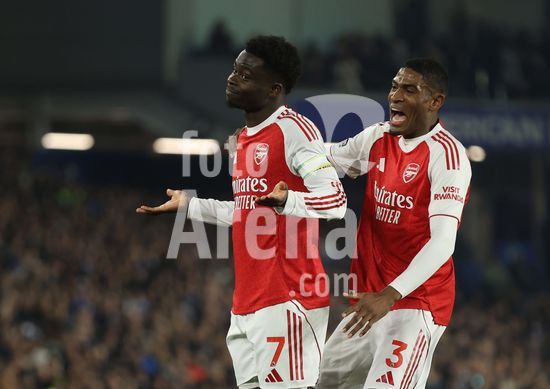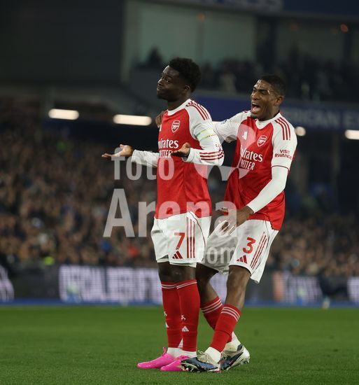 2898253 BRIGHTON, INGLATERRA, 4 DE MARCO: GOL 1-0, Bukayo Saka, do Arsenal, comemora o gol com Cristhian Mosquera, tambem do Arsenal, apos marcar o gol que colocou o Arsenal em vantagem por 1 a 0 durante a partida entre Brighton & Hove Albion FC e Arsenal FC pela Premier League, no AMEX Community Stadium, em Brighton, Inglaterra, em 4 de marco. (Daniel Weir/ SPP)